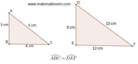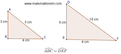 Bu, “DEF üçgeninin kenar uzunlukları ABC üçgeninin 2 katıdır.” veya “ABC üçgeninin kenar uzunlukları DEF üçgeninin yarısıdır.” anlamına gelir.